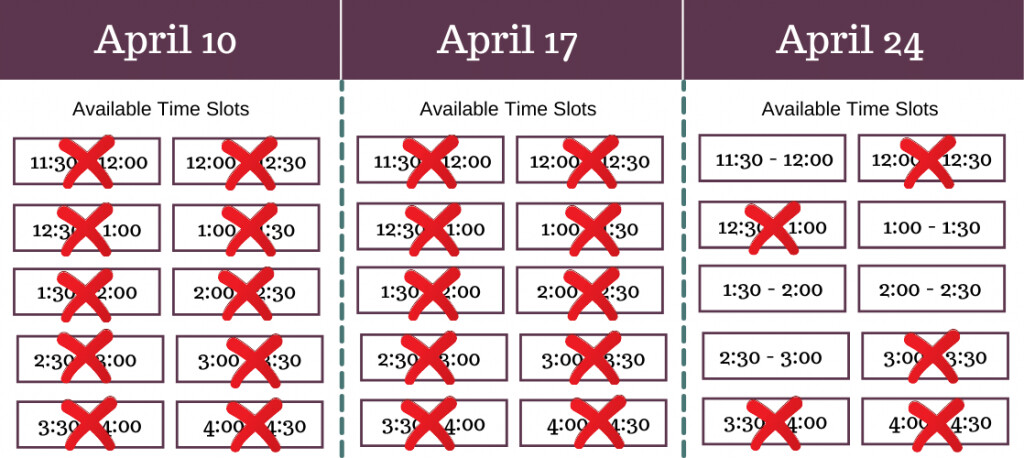 To reserve your private tasting time slot, you need to call our store at 877-469-5025 with your preferred date and time. All reservations have to be paid for in advance. You’ll receive a confirmation email upon reserving your time slot. Available time slots are shown in the table below. We update this table on a daily basis. Unavailable times have an “x” through them.